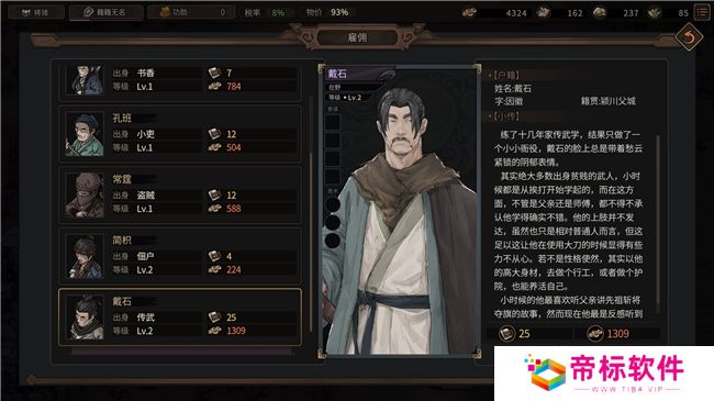 在这一过程中,一支忠心的近卫队必不可少。游戏中玩家可以在各大城市中招募人才为己用,他们就像《骑马与砍杀》《部落与弯刀》中的英雄单位那样,玩家可以为他们更换装备设计技能,派他们承担不同的职务。并且为增加代入感,猛将三国中所可招募NPC角色,都有一段符合自己能力与身份的小传,以及随机生成的天赋特性,令这些程序生成的角色更加有血有肉。