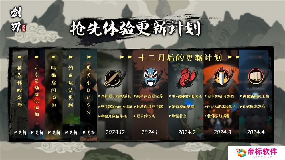 本作曾在Steam10月新品接上线Demo版本,相较于Demo版本,抢先体验版目前已更新【4周目游戏内容】、【元素互动Build】、【赐福房间】、【休闲钓鱼玩法】等内容,整体游戏内容将是Demo版本的2倍多,在上线当天游戏的制作团队也放出了后续版本的更新计划。